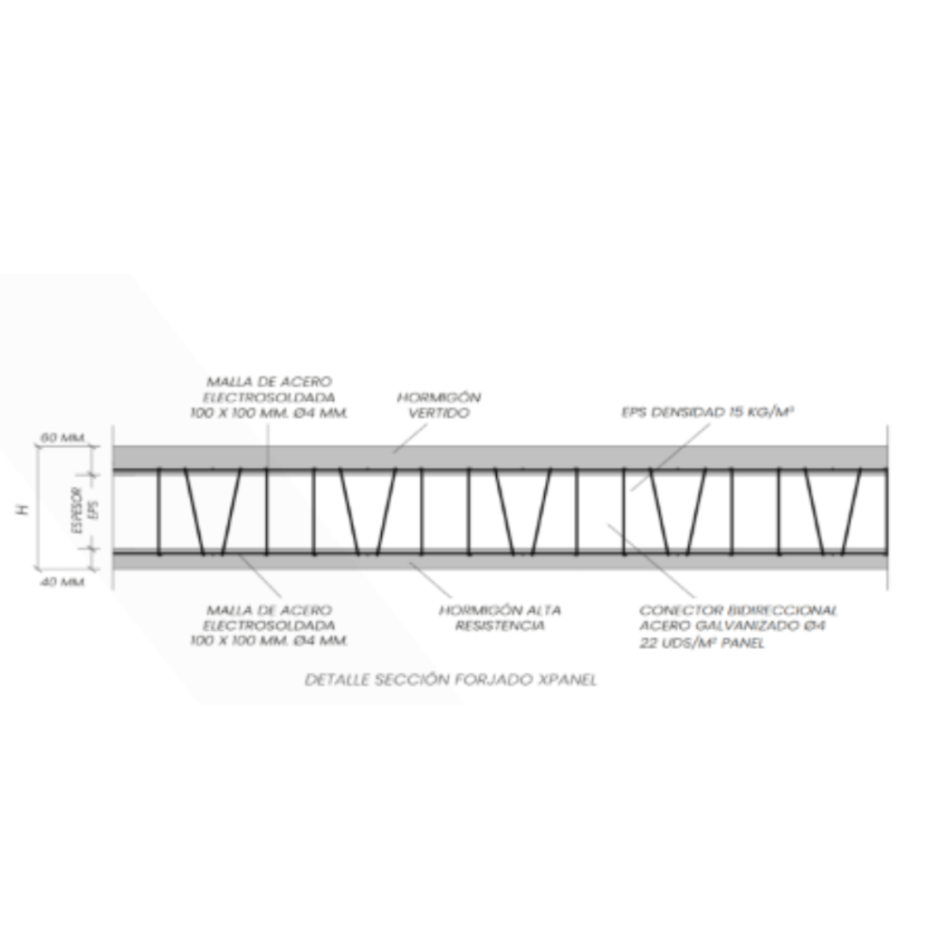 Xpanel se basa en un conjunto de paneles de EPS con malla electrosoldada de acero galvanizado en cada cara, formada por barras de acero de alta resistencia unidos entre si mediante conectores inclinados de acero galvanizado orientados en dos direcciones.
